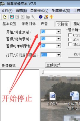 4、界面切換到“快捷鍵”,對開始、停止、暫停、繼續(xù)的快捷方式進(jìn)行設(shè)置,建議設(shè)置成自己熟悉的,因為錄制視頻的時候,遇到突發(fā)狀況,需要對視頻進(jìn)行暫停錄制。