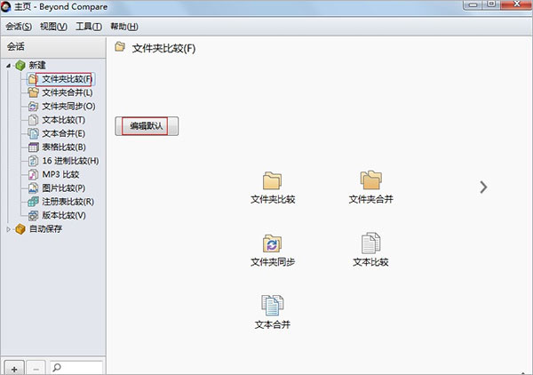 1、打開軟件,選擇左邊的“文件夾比較”,在右邊的界面點(diǎn)擊“編輯默認(rèn)”按鈕,從而來改變文件夾比較時的默認(rèn)設(shè)置;