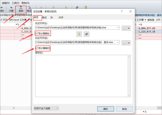 但絕大多數(shù)情況下軟件會禁止表格編輯。我們需要設(shè)置一下允許編輯,首先點(diǎn)擊“規(guī)則”,接著選擇“規(guī)范”,然后取消勾選“禁止編輯”,最后點(diǎn)擊一下“確定”,我們就可以直接在Beyond Compare中修改表格內(nèi)容了。