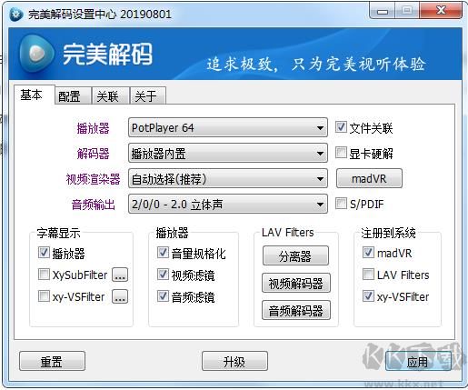 完美解碼播放器是一款用于音視頻、高清4k多媒體文件軟硬解播放的影音解碼包,集成了當(dāng)前最流行的Potplayer播放器面成的完美解碼播放器,可以播放任何視頻文件格式,效果非常好。影片發(fā)燒友必備軟件。PotPlayer比較適合輕度觀影,對(duì)高清需求不高的用戶,而加入了完美解碼之后,那么可以觀看更加高清層次的影片~,完美解碼的口號(hào)是追求極致、完美視聽體驗(yàn),小編力薦。