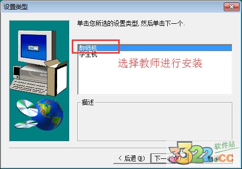 1、安裝時請選擇安裝教師機(jī),如下圖(選擇學(xué)生機(jī)進(jìn)行安裝的話,很多功能將被限制)