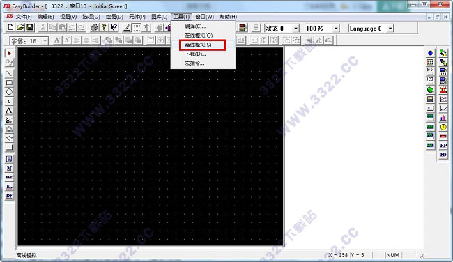 7、選擇菜單[工具]/[離線模擬].這時就可以看到我們剛剛創(chuàng)建的新空白工程的模擬圖了