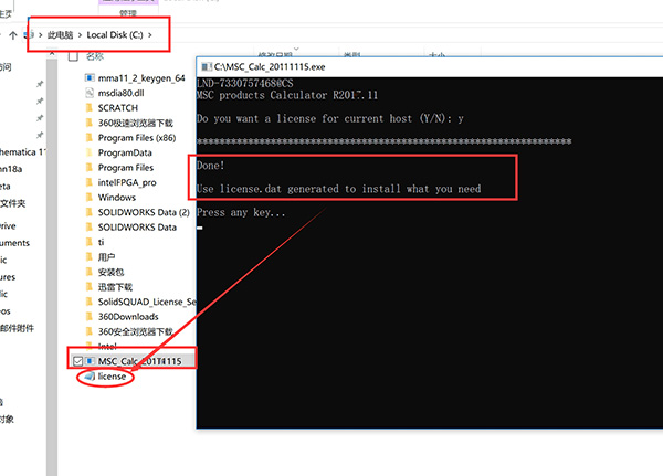 3、然后在MAGNiTUDE文件夾中找到MSC_Calc_20180531.exe移動到c盤根目錄,再次運(yùn)行點(diǎn)y,生成激活文件license.dat