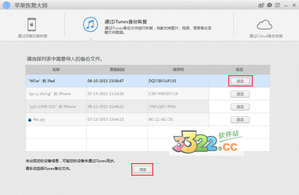 第二步:選擇想要恢復的備份文件,點擊【選定】。若未出現(xiàn)設備信息,可點擊下方的【瀏覽】手動選擇 iTunes 備份文件。