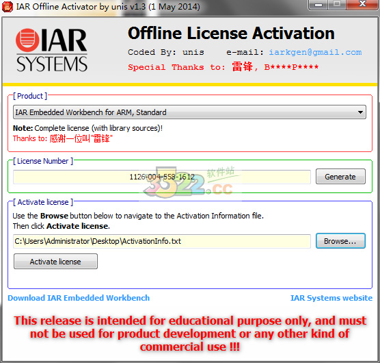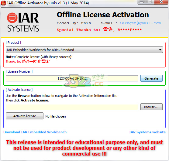 4、在注冊(cè)機(jī)中選擇好軟件,我們的軟件全稱(chēng)是IAR Embedded Workbench for ARM。然后將激活碼生成,復(fù)制到注冊(cè)窗口。