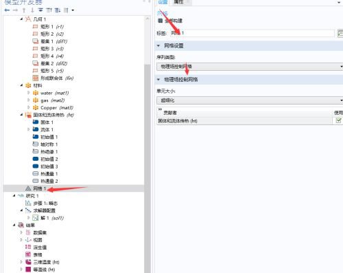 4、第四步:進入最終模型導航,建立所研究問題的幾何結構以及所需要的材料屬性,如圖所示。材料屬性可以自己定義,也可以通過comsol內置材料庫調取使用。