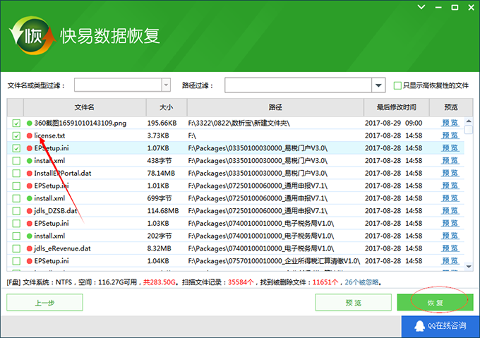 5、選擇需要恢復(fù)的文件,并點(diǎn)擊恢復(fù)開(kāi)始恢復(fù)。
