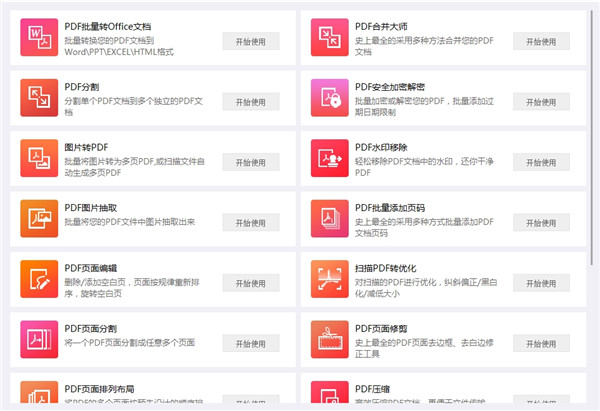 (1)打開PDF工具集,選擇一個(gè)工具后點(diǎn)擊“開始使用”便會(huì)開始下載相關(guān)組件(第一次使用都要下載),下載后便可開始開始使用