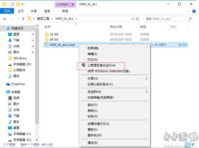 1、下載后解壓,然后右鍵管理員方式運(yùn)行KMS-VL-ALL.cmd即可。