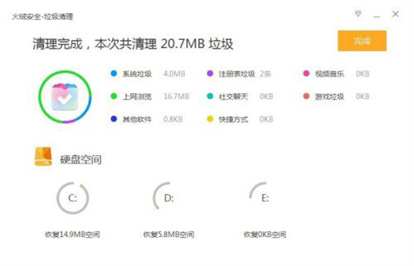 7、第七步,清理完成,本次共清理的垃圾有多少M(fèi)B,同時(shí)也告訴你各個(gè)分區(qū)恢復(fù)了多少M(fèi)B的空間。這點(diǎn)非常人性化。