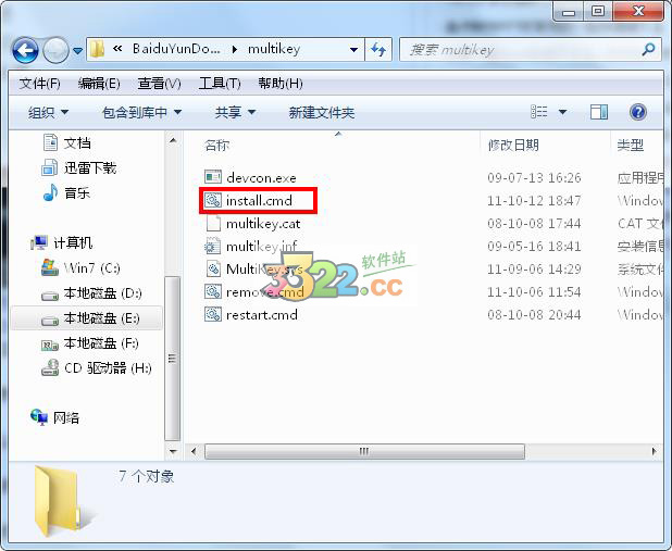6、首先安裝虛擬狗,打開multikey文件夾,運(yùn)行其中的“install.cmd”。如果安裝不了說明用戶沒有關(guān)閉強(qiáng)制數(shù)字簽證,用戶可以百度如何關(guān)閉,小編簡(jiǎn)單說一下,就是開機(jī)以后按F8進(jìn)入,然后選擇禁用強(qiáng)制數(shù)字簽證安裝驅(qū)動(dòng)程序即可,會(huì)被360誤報(bào)病毒,請(qǐng)?zhí)砑有湃巍?br />