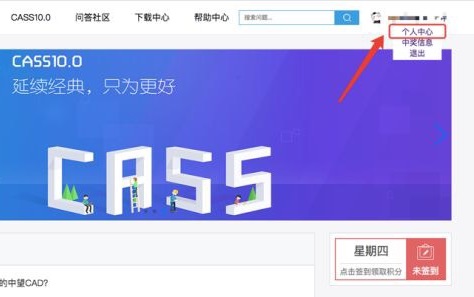 2、登錄成功后,在頁面右上角點擊您的個人頭像的小三角形進入“中獎信息”頁面,如kkx分享的截圖:(注:如果是通過CASS10試用申請獲得的試用劵點擊“個人中心”)