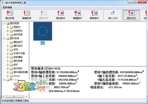 ps:注意到上面的按鈕欄有的是灰色的。所有型材或圖形的操作都需要基于目錄進行操作,如果沒有選擇適當?shù)哪夸?,則所有操作按鈕均不可使用。鼠標選擇“型材目錄”,如“型材目錄”下面包含型材截面圖,則右邊自動顯示所包含的型材圖形,否則,不顯示任何圖形。但是有幾個按鈕可用,可以在當前選定目錄下增加目錄、編輯目錄、增加型材等操作。