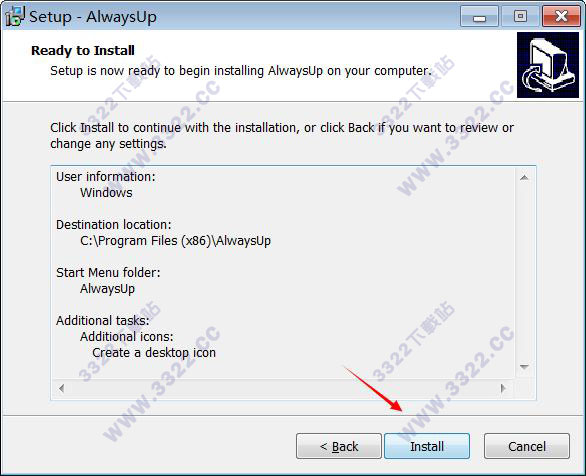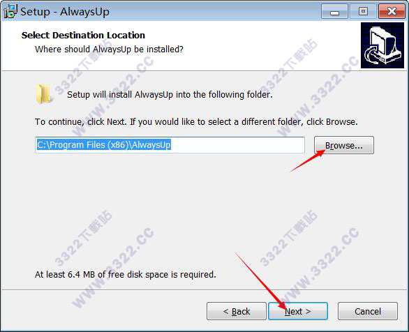 3、選擇程序的安裝路徑,默認(rèn)路徑為C:\Program Files (x86)\AlwaysUp,可點(diǎn)擊browse更換安裝路徑,或直接默認(rèn),請(qǐng)確保所選擇的硬盤(pán)滿足其安裝要求