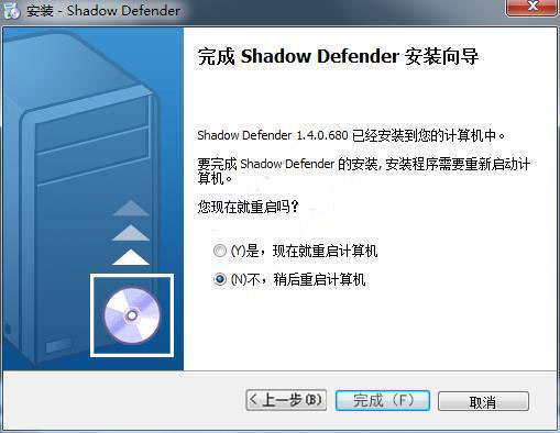 2、特別備注:安裝封裝版SD程序,安裝完畢SD軟件提示重啟,點擊“No-否”那個稍后重啟選項,然后用系統(tǒng)內(nèi)置的重啟,重新啟動電腦(因為此過程要寫入注冊腳本)。