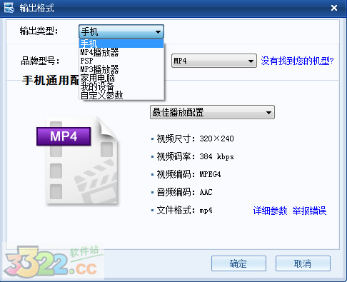 2、再根據(jù)你的移動(dòng)設(shè)備機(jī)型選擇轉(zhuǎn)換配置(點(diǎn)擊詳細(xì)參數(shù)也可以手動(dòng)設(shè)置)