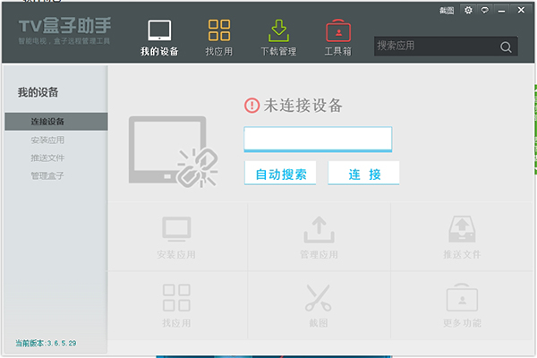 4、打開(kāi)助手:可以連接TV盒子助手,然后進(jìn)行批量安裝、備份、刪除軟件,一鍵root等操作