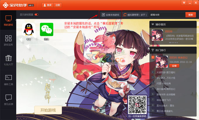 1.啟動(dòng)模擬器之后,在“我的游戲”界面的上方,點(diǎn)擊“安裝本地游戲”進(jìn)行安裝;或者可以將安裝包直接拖入模擬器進(jìn)行安裝。