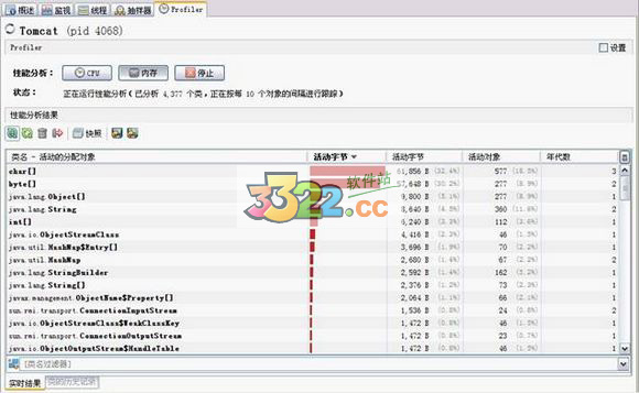 在 Profiler 標簽,點擊“內存”按鈕將啟動一個內存分析會話,等 VisualVM 收集和統(tǒng)計完相關性能數據信息,將會顯示在性能分析結果。通過內存性能分析結果,我們可以查看哪些對象占用了較多的內存,存活的時間比較長等,以便做進一步的優(yōu)化。