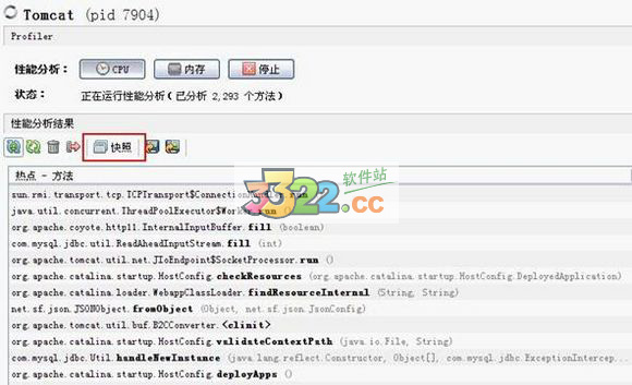 快照:應用程序啟動后,性能分析工具開始收集各種運行時數據,其中一些數據直接顯示在監(jiān)視視圖中,而另外大部分數據被保存在內部,直到用戶要求獲取快照,基于這些保存的數據的統(tǒng)計信息才被顯示出來??煺瞻藨贸绦蛟谝欢螘r間內的執(zhí)行信息,通常有 CPU 快照和內存快照兩種類型。
