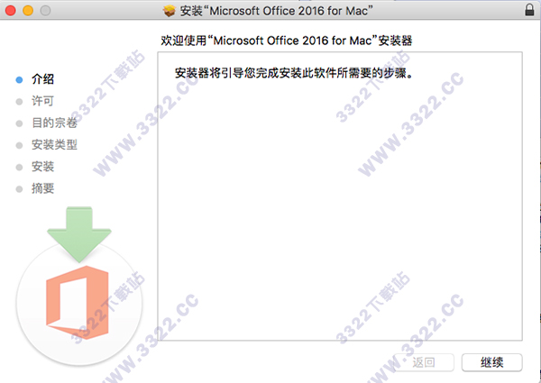 2、之后我們雙擊運(yùn)行“Microsoft_Office_2016_15.40.17110800_Installer.pkg”,安裝包,會彈出一個安裝器簡介窗口,我們點(diǎn)擊“繼續(xù)”,開始進(jìn)行安裝