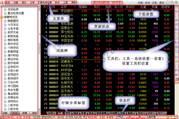 〖狀態(tài)欄〗顯示上證指數(shù)、深證指數(shù)、中小板指數(shù)、多空紅綠軍和連接的行情主站。