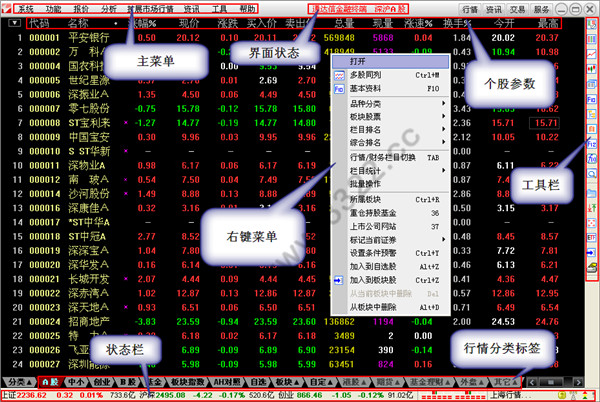 〖菜單欄〗位于系統(tǒng)畫面左上方,包括系統(tǒng)、功能、報價、分析、資訊、擴展行情、深度、工具、幫助等個欄目。用鼠標點擊欄目或同時按下Alt和欄目旁的字母即可打開相應(yīng)欄目的下拉列表。