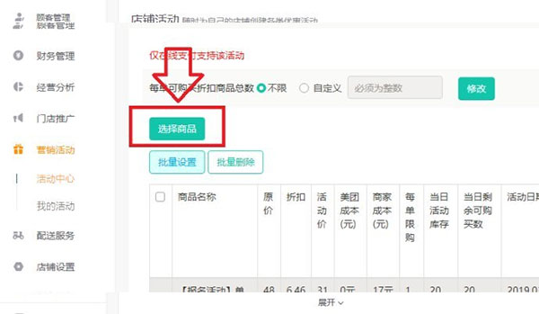 1、打開美團(tuán)外賣商家版電腦版軟件,打開軟件后點(diǎn)擊點(diǎn)擊左側(cè)的【營銷活動】點(diǎn)擊【活動中心】,在右側(cè)界面中點(diǎn)擊【折扣商品】選項,如kkx分享的截圖: