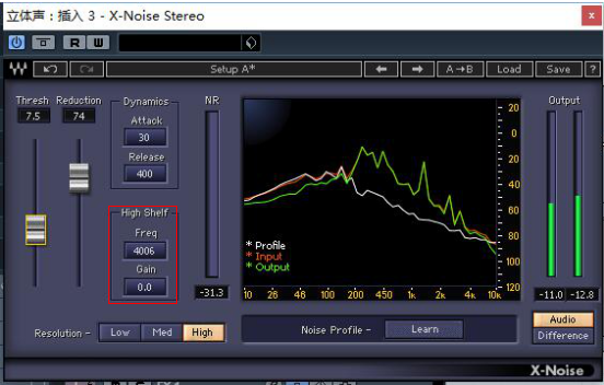 該功能是對(duì)你設(shè)定的目標(biāo)頻率(Freq)以上的所有頻段進(jìn)行更強(qiáng)效的降噪處理。置于加強(qiáng)多少,則是通過(guò)增益(Gain)功能來(lái)進(jìn)行設(shè)置的。增益功能也可以提供一定的減益效果,讓你選定的頻段范圍獲得較少的降噪處理,如kkx分享的圖片: