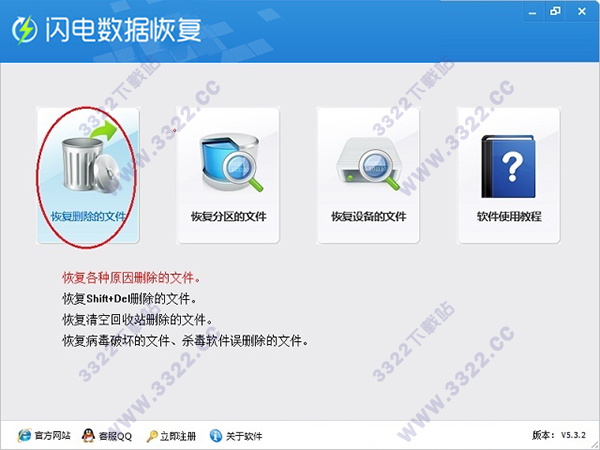 1)進(jìn)入主功能界面,點(diǎn)擊主界面上的恢復(fù)刪除的文件功能按鈕。
