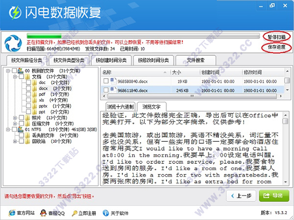 3)數(shù)據(jù)恢復(fù)軟件彈出快速掃描分區(qū)文件的信息框,由于分區(qū)容量、分區(qū)文件格式的不同,快速掃描文件系統(tǒng)可能需要十幾秒到幾十秒鐘,請(qǐng)耐心等待。如果分區(qū)有物理壞道,掃描所需時(shí)間更長(zhǎng),可能需要幾分鐘,掃描過(guò)程中,可以看到發(fā)現(xiàn)了很多文件和目錄,發(fā)現(xiàn)的文件和目錄數(shù)不斷的增加,掃描過(guò)程中,您可以隨時(shí)點(diǎn)擊“暫停按鈕“暫停掃描,查看是否找到了您丟失的數(shù)據(jù),如果沒(méi)有找到您丟失的數(shù)據(jù),可以繼續(xù)當(dāng)前的掃描;或者點(diǎn)擊”保存進(jìn)度“然后退出掃描。