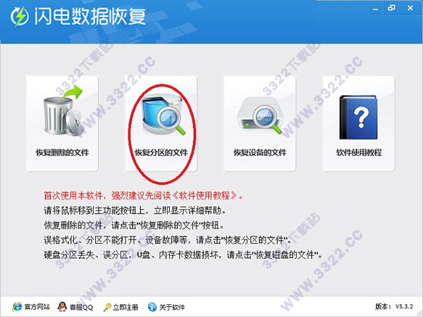 1)進(jìn)入主功能界面,點(diǎn)擊主界面上的恢復(fù)分區(qū)的文件功能按鈕。