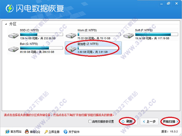 2)進(jìn)入分區(qū)選擇界面,如果您要恢復(fù)的是硬盤的分區(qū),且分區(qū)列表里沒(méi)有您要恢復(fù)文件的分區(qū),請(qǐng)返回主功能界面,選擇恢復(fù)設(shè)備的文件主功能。如果您要恢復(fù)的是移動(dòng)硬盤、U盤、內(nèi)存卡等移動(dòng)存儲(chǔ)設(shè)備的分區(qū),且分區(qū)列表里沒(méi)有您需要恢復(fù)文件的分區(qū),請(qǐng)重新拔插您的移動(dòng)存儲(chǔ)設(shè)備,然后點(diǎn)擊“刷新”按鈕。鼠標(biāo)左鍵點(diǎn)擊您要恢復(fù)文件的分區(qū),然后點(diǎn)擊開(kāi)始掃描按鈕。