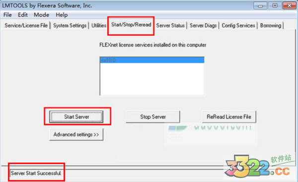 7、再點(diǎn)擊“start/stop/reread”,選中nx10.0,點(diǎn)擊“start server”啟動,出現(xiàn)server start successful表示注冊成功