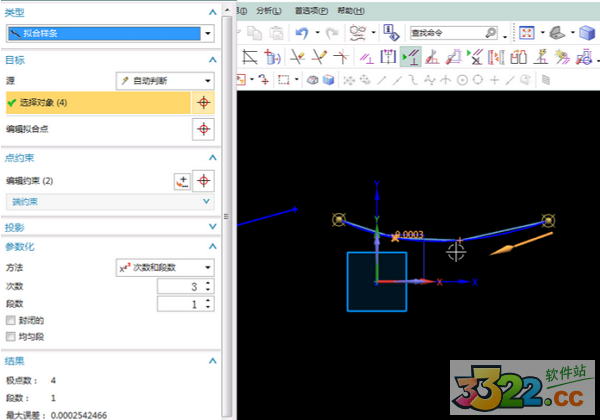 4、通過兩點(diǎn)擬合一條曲線;先繪制任意兩點(diǎn),然后進(jìn)入到擬合樣條工具中,結(jié)果如下圖