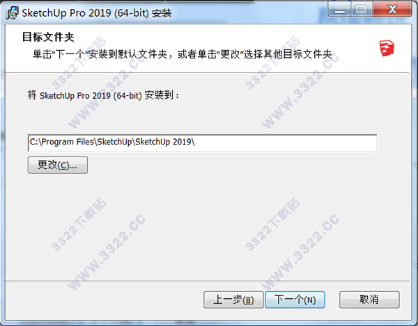 4、選擇軟件安裝目錄C:\Program Files\SketchUp\SketchUp 2019\,修改點擊更改,點擊下一步繼續(xù),如圖所示: