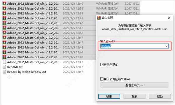 1、下載后對(duì)其進(jìn)行解壓,同時(shí)需要輸入解壓密碼@vposy,由于軟件過(guò)大,因此解壓會(huì)比較耗時(shí),如果在解壓時(shí)出現(xiàn)了問(wèn)題可能是有的包沒(méi)下載完整或下載時(shí)出錯(cuò)了,畢竟下載大文件非常容易出現(xiàn)壞檔,下載壓縮包后注意校驗(yàn);