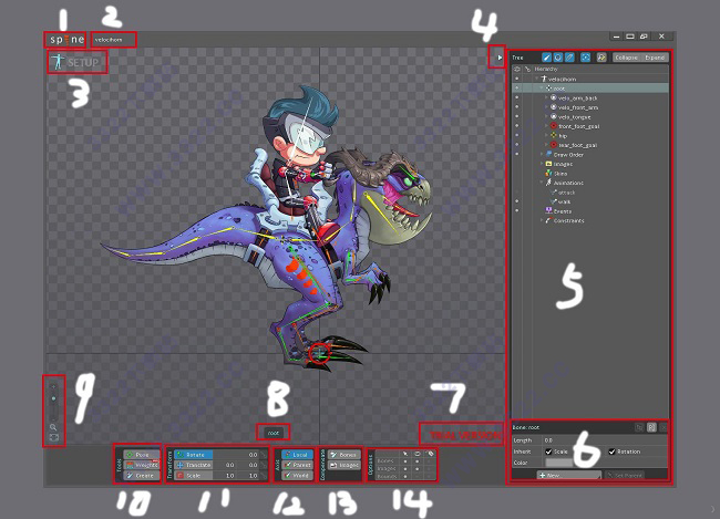 10.創(chuàng)建:可以在骨骼下創(chuàng)建骨骼、資源夾(Slot)、皮膚占位符(Skin Placeholder)、邊界框(Bounding Box)。不要問為什么不能創(chuàng)建圖片這么2的問題了吧。都說了圖片是從圖片(Images)拖到進(jìn)來的。