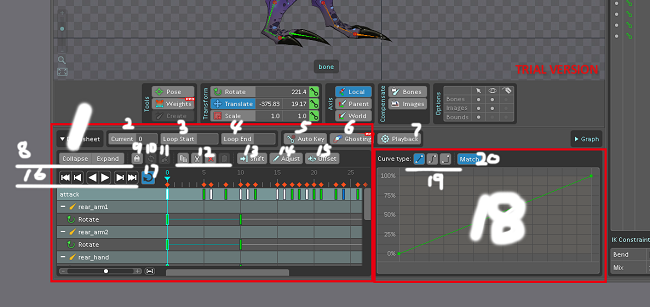 18.曲線編輯器:本來這里才應(yīng)該是動(dòng)畫師的主戰(zhàn)場。不過Spine中,曲線編輯器只算是個(gè)配角了。只能顯示兩幀之間的過度。