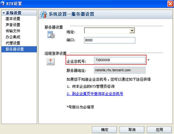 2. 輸入“企業(yè)總機(jī)號碼”后點(diǎn)擊確定。用遠(yuǎn)程登陸模式時(shí),服務(wù)器地址不用填寫。如1.6所示。