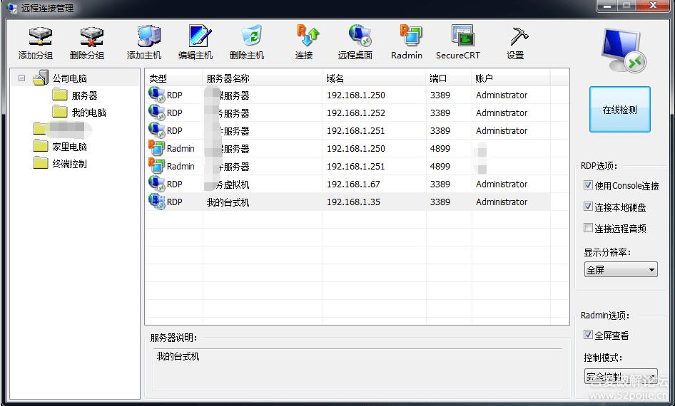 我的遠(yuǎn)程桌面是吾愛網(wǎng)友寫的一款RADMIN+SSH連接管理軟件,強(qiáng)大的遠(yuǎn)程桌面管理工具。它具有非常多的功能,支持遠(yuǎn)程桌面、RADMIN、SSH主機(jī)的管理,雙擊主機(jī)即可打開連接。是網(wǎng)維人員,站長必備的一款工具,本軟件開源,所以大家不必?fù)?dān)心安全問題。