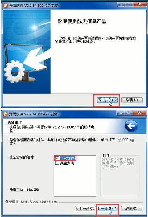 二、將下載的開(kāi)票軟件V2.2.34.190427解壓,安裝時(shí)點(diǎn)擊“升級(jí)安裝”直到下一步完成即可。