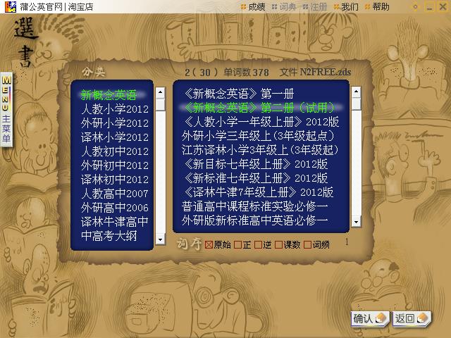 包含劍橋少兒英語、各種版本的小學(xué)、初中、高中、大學(xué)、研究生、自考、公共英語、成人高考、新概念英語、許國(guó)璋英語、走遍美國(guó)、雙向式英語、托福、雅思、SAT、GRE、MBA、公共英語、外貿(mào)英語、商務(wù)英語、職稱英語、計(jì)算機(jī)英語、醫(yī)學(xué)英語、電大英語、美國(guó)之音等共計(jì)約400本教材的詞庫(kù)[1] 。