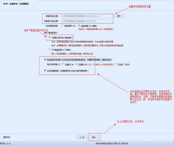 10、選擇導(dǎo)出數(shù)據(jù)包位置、導(dǎo)出文件類型及商品描述圖片處理方式,再點擊“導(dǎo)出”按鈕。
