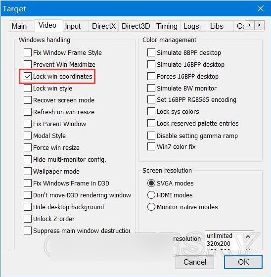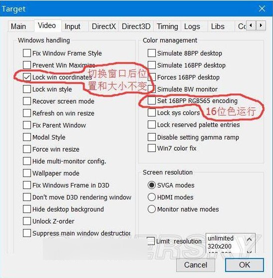3、“Lock win coordinates”建議所有游戲都勾上,不然切換到別的窗口后再切回游戲窗口會變?yōu)橛螒蚰J分辨率大小;如果游戲花屏則需要勾上16位色運行,仙劍系列只有仙二要勾上。