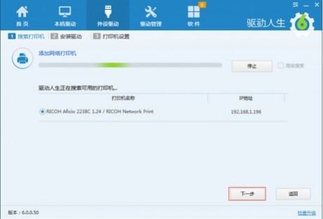 第一步,搜索打印機(jī),搜索局域網(wǎng)內(nèi)的打印機(jī)設(shè)備。只要打印機(jī)在局域網(wǎng)內(nèi),驅(qū)動人生就可以搜索到打印機(jī)設(shè)備的名稱。搜索到打印機(jī)后,點擊下一步。