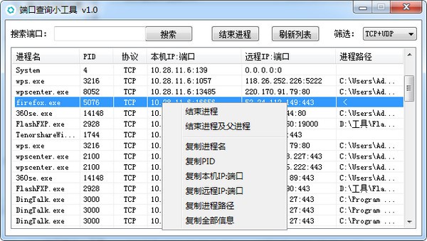 軟件功能很簡單,就是列出所有本地監(jiān)聽端口的進程信息,自行選擇結(jié)束進程,太多找不到端口的話,可以搜索端口。