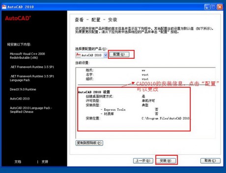確認CAD2010的安裝信息后點擊“安裝”開始安裝CAD2010 32位中文版 點擊“配置”可以修改CAD2010的安裝信息 如圖七。