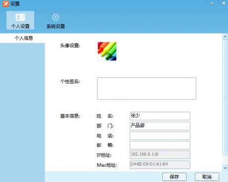 1.通過“個人設(shè)置”,用戶可以自定義頭像、修改簽名、姓名、部門等信息,點擊保存后,局域網(wǎng)用戶可以查看到您設(shè)置的信息。