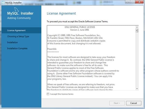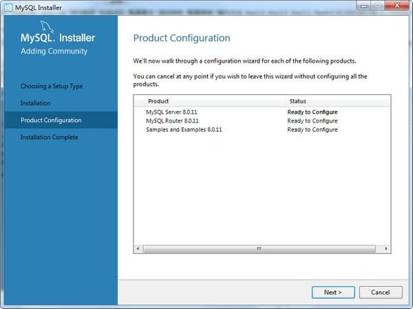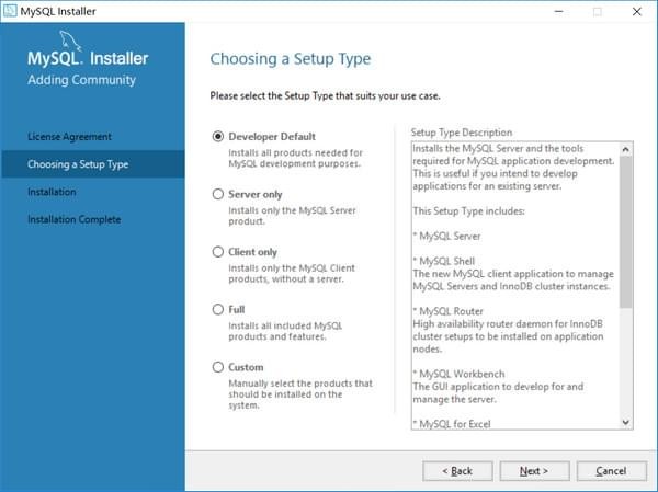 第一個選項包含了一些MySQL其他組件,如果只安裝MySQL數(shù)據(jù)庫,選擇第二項Server only就行。這里我直接選擇默認(rèn)的Developer Default